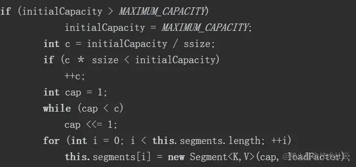 initialCapacity是初始化容量,loadfactor是每个segment的负载因子,这两参数用来初始化数组中的segment