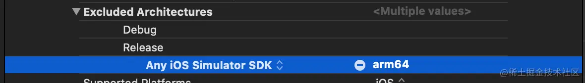 lipo -info framework的路径 - M1的Mac之后编译的模拟器framework只有arm64了,x86_64的没有了。这时需要用到另一个设置,