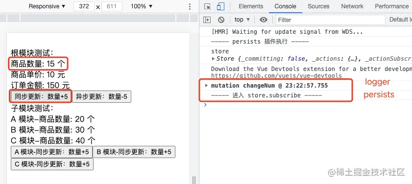 点击按钮,触发根模块 mutation 类型 changeNum 方法,按照插件注册顺序执行 logger、persists 插件;