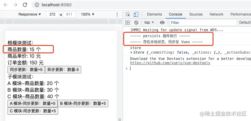 触发 subscribe 状态变更事件订阅的回调方法,将新状态保存至本地存储 localStorage,根模块商品数量状态 num 由 10 更新为 15;