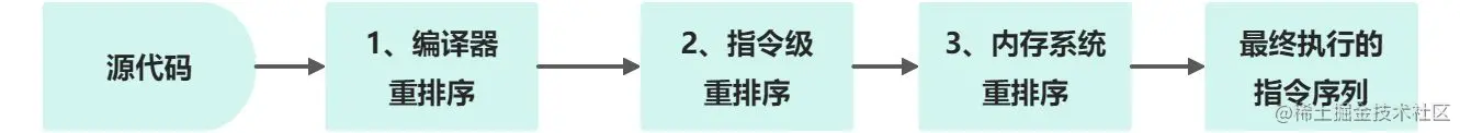 从Java源代码的最终实际执行的指令序列,会分别经历下面3种重排序,其中1属于编译器重排序,2和3属于处理器重排序。