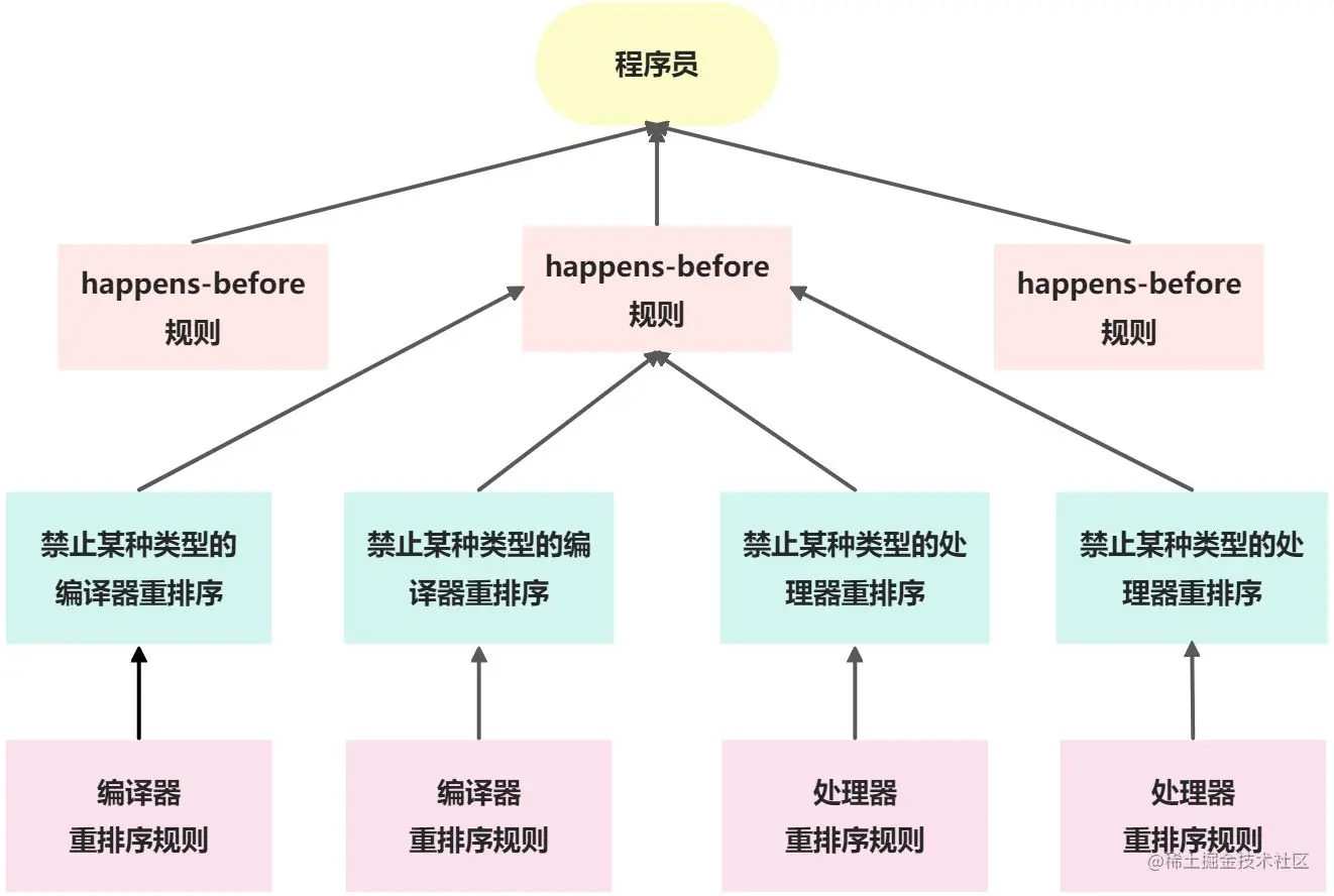 一个happens-before规则对应于一个或多个编译器个处理器重排序规则。对于Java程序员来说,happens-before规则简单易懂,它避免了Java程序员为了理解JMM提供的内存可见性保证而去学习复杂的重排序规则以及这些规则的具体实现方法。