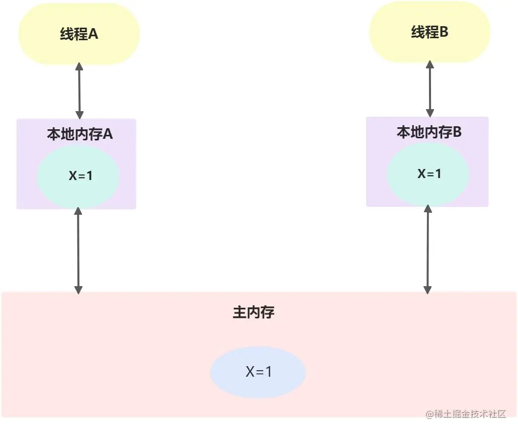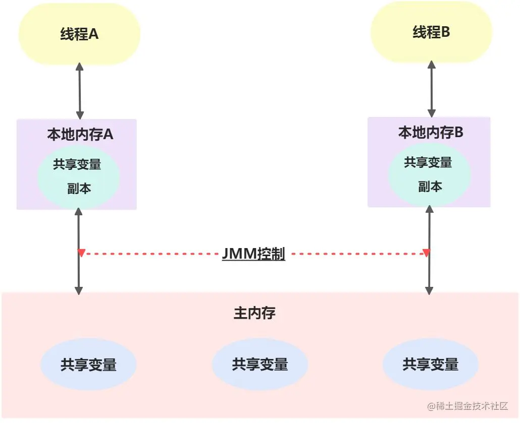 从整体来看,这两个步骤实质上是线程A在向线程B发送消息,而且这个通信过程必须要经过主内存。JMM通过控制主内存与每个线程的本地内存之间的交互,来为Java程序员提供内存可见性保证。