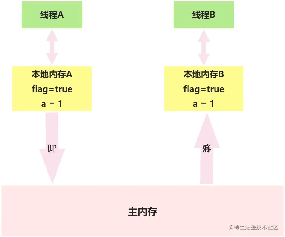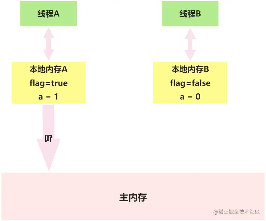 线程A在写flag变量后,本地内存A中被线程A更新过的两个共享变量的值被刷新到主内存中,此时A的本地内存和主内存中的值是一致的。