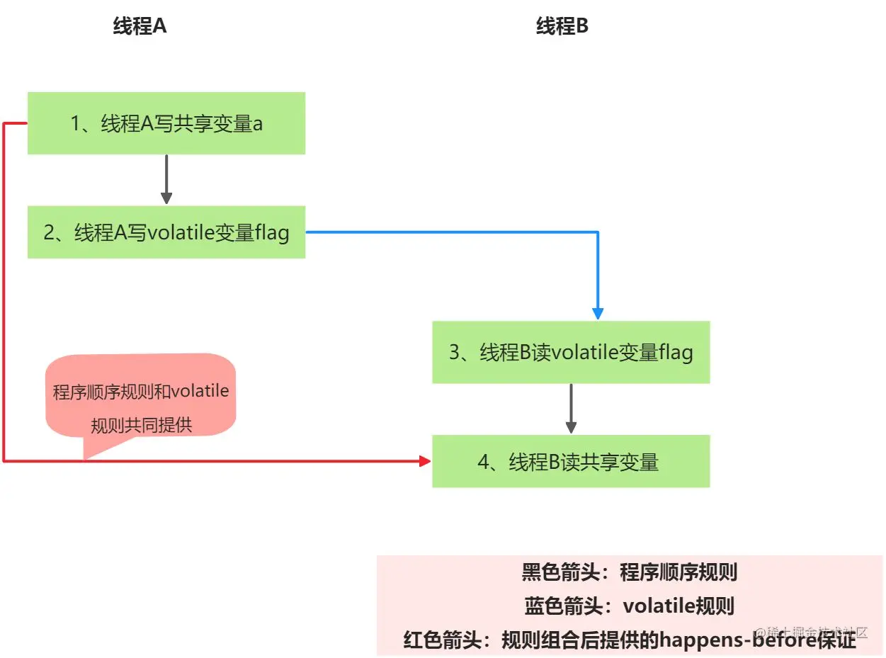 - 线程B读一个volatile变量,实质上是线程B接收了之前某个线程发出的(在写这个volatile变量之前对共享变量所做修改的)消息。