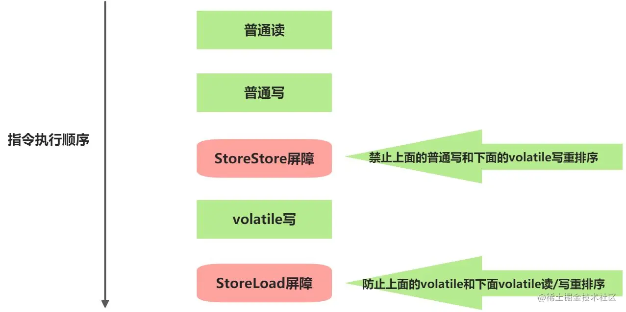 StoreStore屏障可以保证在volatile写之前,其前面所有普通写操作已经对任意处理器可见了。这是因为StoreStore屏障将保障上面所有普通写在volatile写之前刷新到主内存。