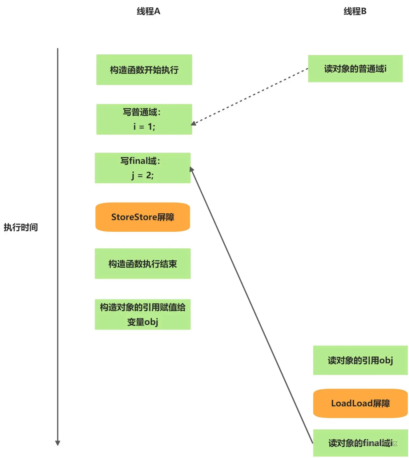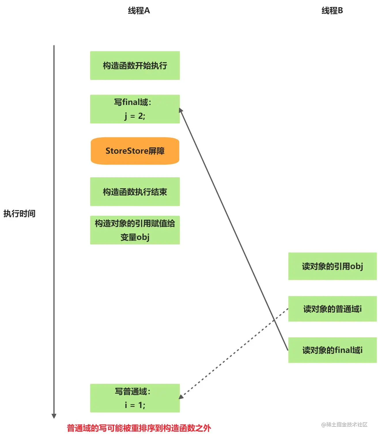 首先假设线程B读对象引用与读对象的成员域之间没有重排序,则下图是其一种执行可能