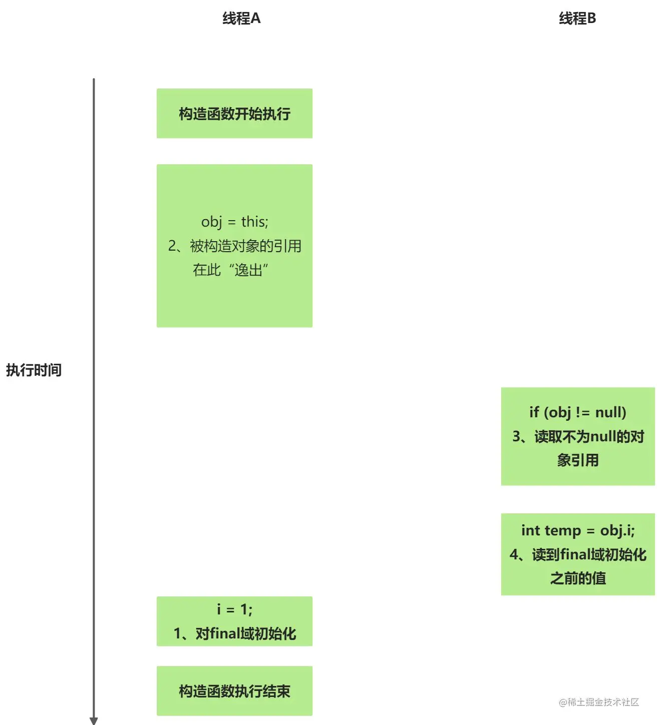 其实这需要另一个条件:在构造函数内部,不能让这个被构造对象的引用被其它线程所见。也就是对象引用不能在构造函数中“逸出”。