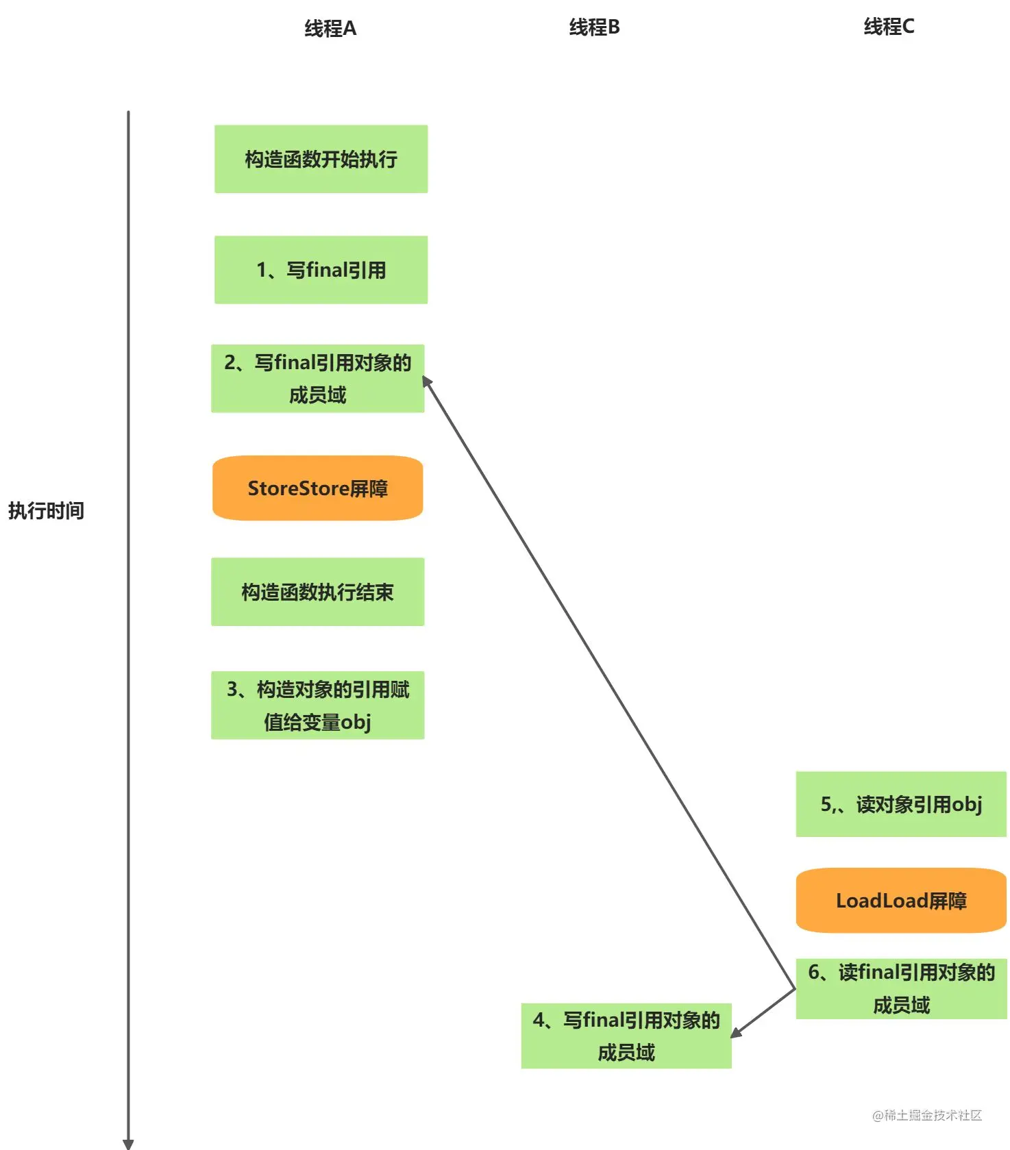 假设线程A执行writer()方法,线程B执行reader()方法。这里操作2导致对象还未完成构造前就对线程B可见了。因为1和2允许重排序,所以线程B可能无法看到final域被正确初始化后的值。实际执行的时序图可能如下所示: