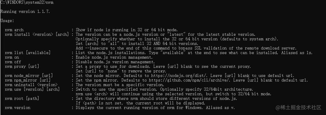 nvm arch:显示node是运行在32位还是64位系统上的nvm on:开启nodejs版本管理nvm off:关闭nodejs版本管理nvm proxy [url]:设置下载代理。不加可选参数url,显示当前代理。将url设置为none则移除代理。nvm node_mirror [url]:设置node镜像。默认是nodejs.org/dist/。如果不写url,则使用默认url。设置后可至安装目录settings.txt文件查看,也可直接在该文件操作。nvm npm_mirror [url]:设置npm镜像。github.com/npm/cli/arc…。如果不写url,则使用默认url。设置后可至安装目录settings.txt文件查看,也可直接在该文件操作。nvm root [path]:设置存储不同版本node的目录。如果未设置,默认使用当前目录。nvm version:显示nvm版本。version可简化为v。