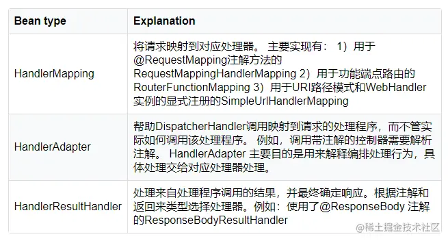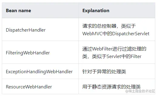 最终WebFluxConfigurationSupport 不仅配置DispatcherHandler 还同时配置了其他很多WebFlux核心组件包括 异常处理器WebExceptionHandler,映射处理器处理器HandlerMapping,请求适配器HandlerAdapter,响应处理器HandlerResultHandler 等。