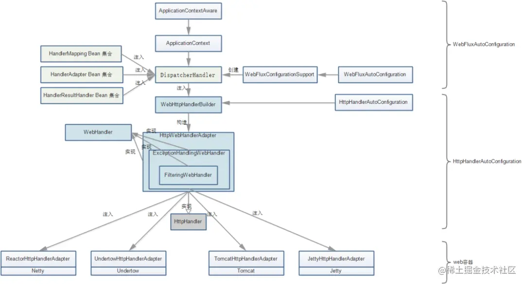 org.springframework.boot.web.reactive.context.ReactiveWebServerApplicationContext#createWebServer 。在创建WebServerManager 容器管理器时会获取对应web容器实例,并注入响应的HTTPHandler。