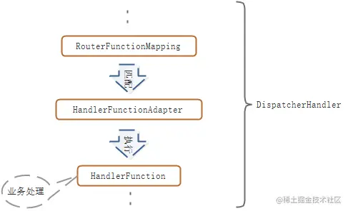 这是一个轻量级函数编程模型。是基于@Controller,@RequestMapping等注解的编程模型的替代方案,提供一套函数式API 用于创建Router,Handler和Filter。调用处理组件如下: