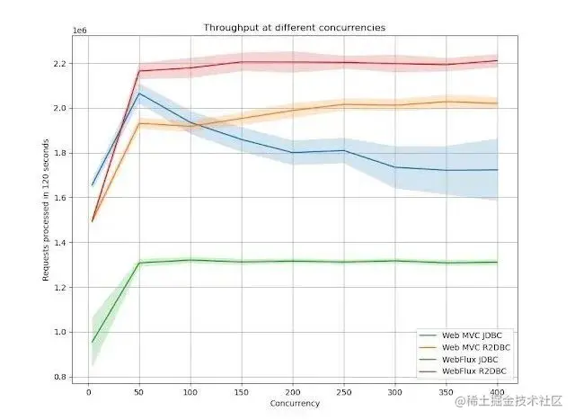 Spring WebFlux + R2DBC 在高并发下,吞吐量表现优异。
