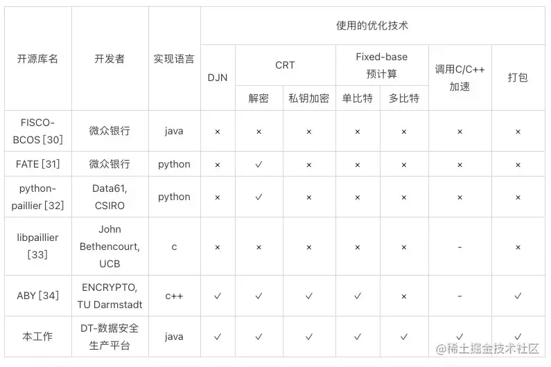 其他的支持加法同态的密码系统还有DGK [5]、OU [6]和基于格密码的方案[12]等。其中,DGK方案的密文空间相比Paillier更小,加解密效率更高,但由于算法的正确性和安全性在学术界没有得到广泛研究和验证,且我们的实验表明算法的加解密部分存在缺陷,不推荐在工业界代码中使用。OU和基于格的加法同态计算效率更高,也是PHE不错的候选项。其中OU的在方案中的使用频率相对较低,而基于格的方案密文大小较大,在一些特定场景有自身的优势。