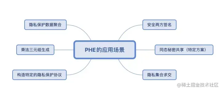 由于通用安全计算方法的一些不足,以及在一些特定场景只需要使用一种HE运算(如加法)即可完成功能,PHE在隐私计算领域得到了大量使用,在多个开源库(如FATE[31])和大量学术顶会(如S&P、NDSS等41811)的方案中都有它的身影。PHE的高效、支持无限次加法或乘法的特点,使其成为隐私计算的重要基本组件,可辅助完成多种隐私计算功能:
