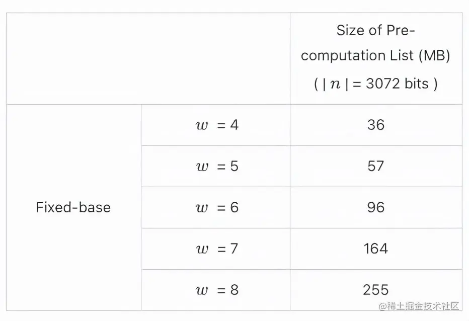 使用Fixed-base预计算优化需要提前生成预计算list,list占用的空间大小与窗口大小w的大小见表4.3。