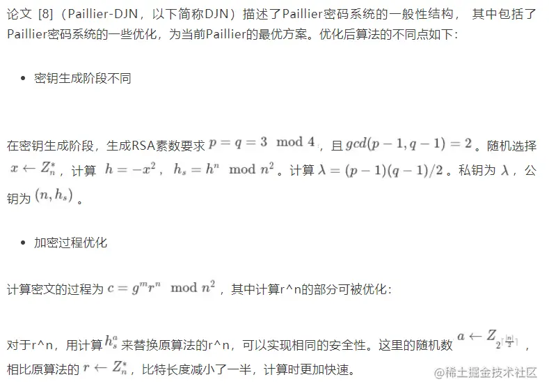 Paillier是一个支持加法同态的公钥密码系统 [1],由Paillier在1999年的欧密会(EUROCRYPT)上首次提出。此后,在PKC'01中提出了Paillier方案的简化版本26,是当前Paillier方案的最优方案。在众多PHE方案中,Paillier方案由于效率较高、安全性证明完备的特点,在各大顶会和实际应用中被广泛使用,是隐私计算场景中最常用的PHE实例化方案之一。