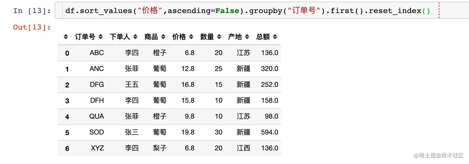 df.groupby("订单号").apply(lambda x: x.sort_values("价格",ascending=False)).reset_index(drop=True).groupby("订单号").first().reset_index()