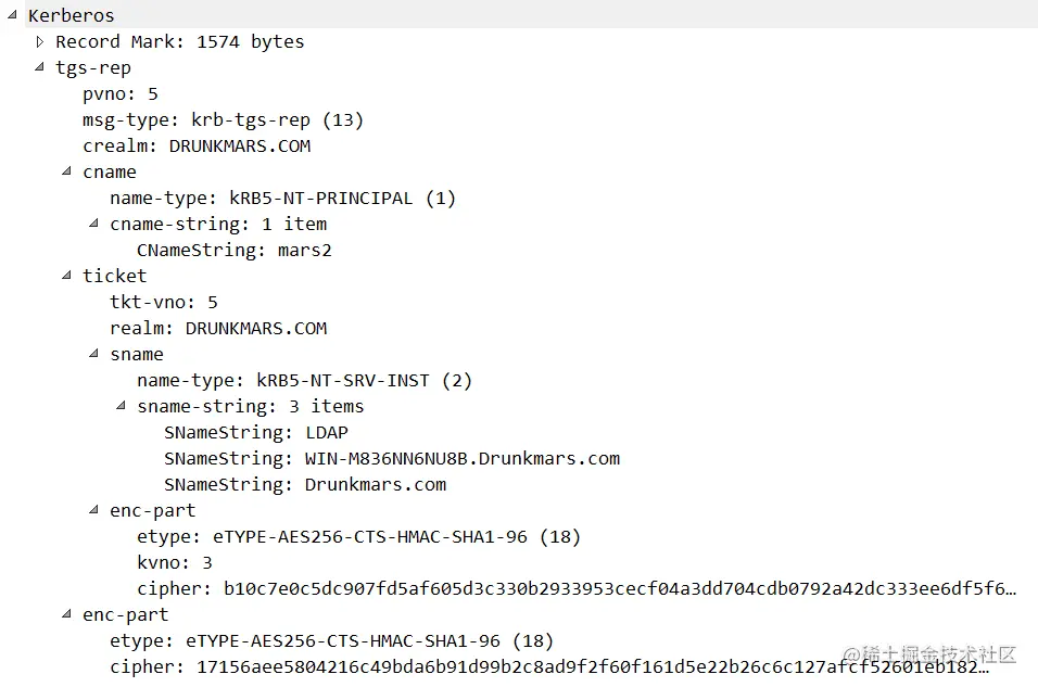 4.攻击者从 TGS-REP 中提取加密的服务票证。 由于服务票证是用链接到请求 SPN 的帐户的哈希加密的,所以攻击者可以离线破解这个加密块,恢复帐户的明文密码。