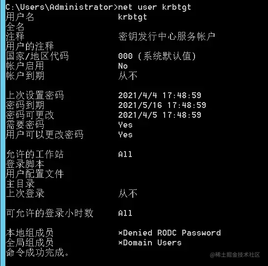krbtgt用户,是系统在创建域时自动生成的一个帐号,其作用是密钥分发中心的服务账号,其密码是系统随机生成的,无法登录主机