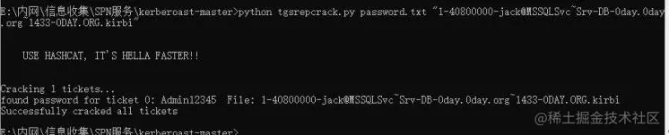该脚本可以请求注册于用户下的所有SPN的服务票据。使用该脚本需要提供域账号密码才能查询。该脚本直接输出hashcat格式的服务票据,可用hashcat直接爆破。