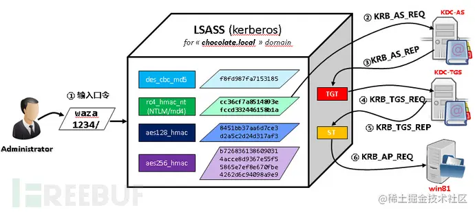 1.攻击者对一个域进行身份验证,然后从域控制器获得一个TGT认购权证,该TGT认购权证用于以后的ST服务票据请求