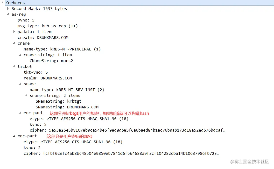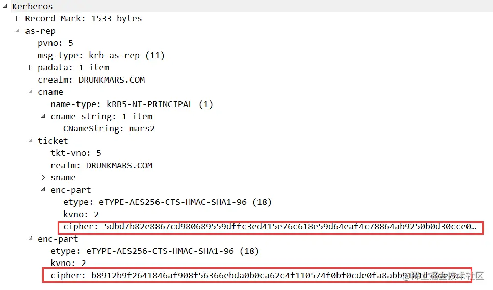 cname:客户端用户名,这个用户名存在和不存在,返回的包有差异,可以用于枚举域内用户名,PrincipalName类型,包含type和Value