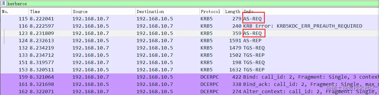 AS-REQ:当域内某个用户试图访问域中的某个服务,输入用户名和密码,本机的kerberos服务向KDC的AS认证服务发送一个AS-REQ认证请求,请求中包含:请求的用户名、客户端主机名、加密类型和Authenticator(用户NTML Hash加密的时间戳)以及其他的一些信息