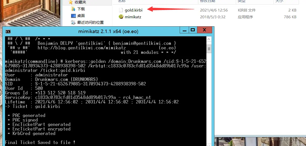 伪造administrator执行(krbtgt hash)生成gold.kirbi