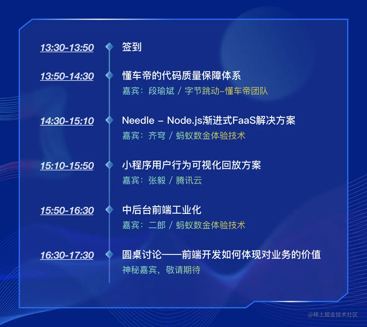 本次活动时间定在了“1024”程序员日,****这一次,我们邀请到了来自蚂蚁、字节、腾讯等团队的分享嘉宾,精选分享议题,为大家打造更有价值的线下交流会。现场不仅有精美礼品、免费茶歇等诸多惊喜,更是干货满满。快来报名参与吧!欢迎扫码报名或直接访问如下链接报名:www.yuque.com/forms/share…