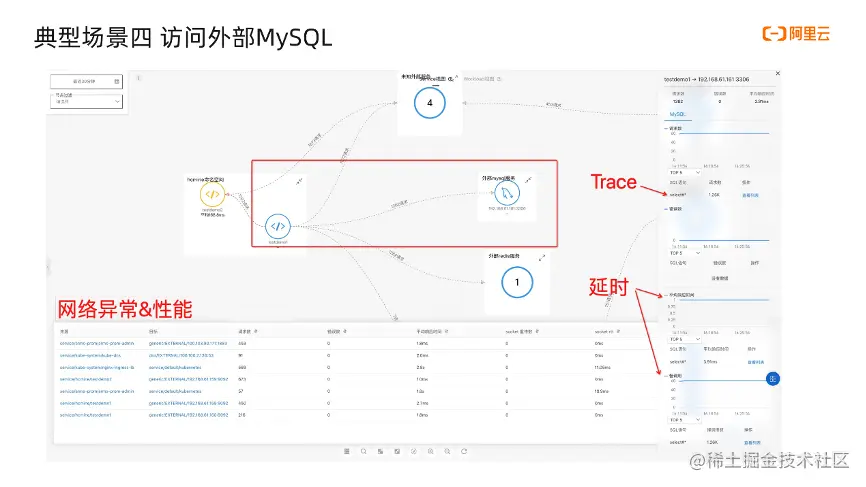 接下来看下拓扑图,中间框住的应用依赖了外部的 MySQL 服务,点击拓扑线可以进一步看黄金指标,点击查看列表可以进一步看请求的详情、响应等。同时我们也可以看下网络性能指标,这个 table 是将当前拓扑中的网络数据根据来源和目标进行归类,可以分别查看请求数、错误数、平均响应时间、socket 重传、socket rtt,点击上面箭头可以对应地排序。