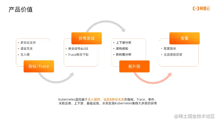 - 虽然 Kubernetes 和容器对上层应用屏蔽了底层的复杂度,但是带来的两个结果是:基础设施层越来越高;另一个是上层应用和基础设施之间信息变得越来越复杂了。举个例子,用户反馈网站访问很慢,管理员查看访问日志、服务状态、资源水位发现都没问题,这时候不知道问题出现在哪里,虽然怀疑基础设施有问题,但无法定界的情况下只能一个一个排查效率低,问题的根源就是上层应用和基础设施之间缺少上下问题关联,无法做到端到端串联。