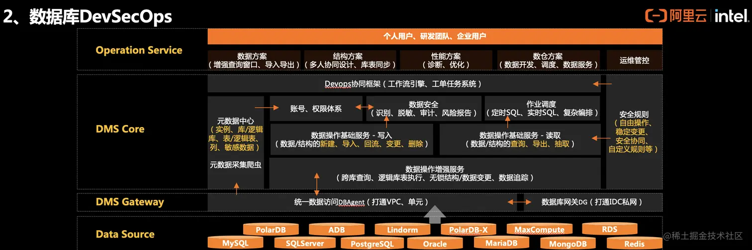 第二个部分的核心能力是DevOps,安全和整个开发平台是结合在一起的。我们的整个平台其实有点像workbench是面向开发者的,底下对接着非常多的数据源,上面提供丰富的开发者开发工具集,因此DMS的平台在云上已经有超过10万个周活用户,它会帮助用户去做数据库的表结构设计,数据变更,以及相关的发布。我们提供安全规则引擎,它会内嵌在企业数据库开发的整个操作过程中,开发者会在一个受控的权限体系里面获得最大的便利性,安全和效率得到很好的平衡,这是整个设计的核心的理念。