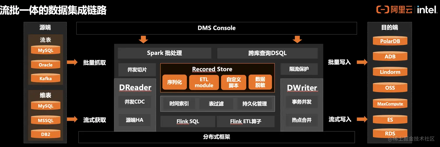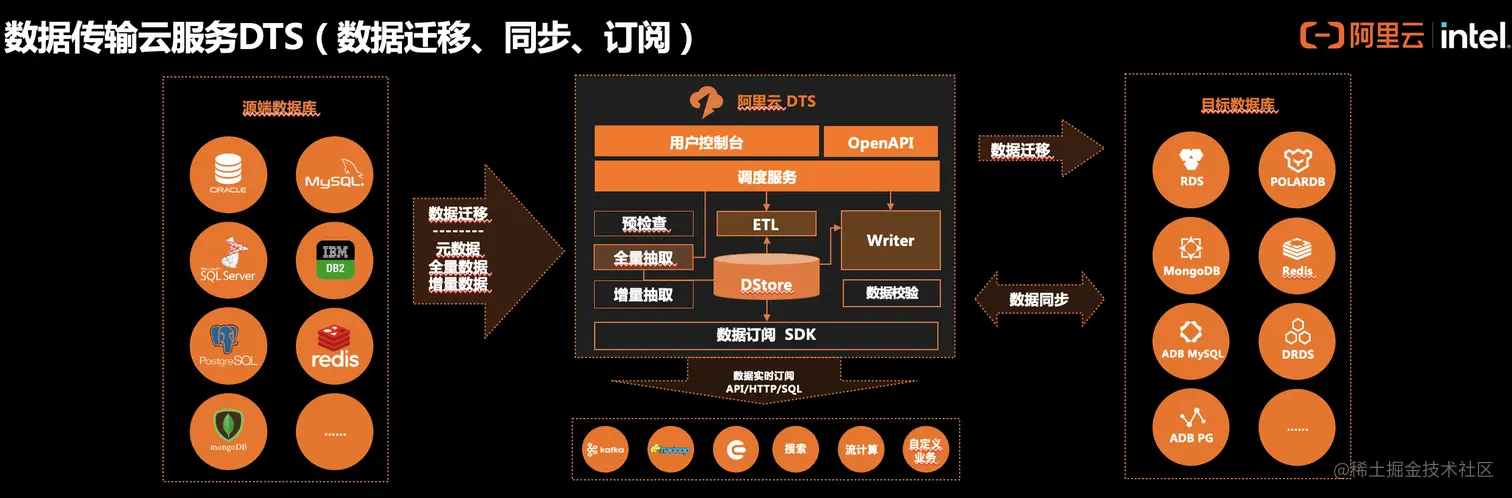 整个DMS底下的数据传输会基于阿里云底层建设的数据传输服务,传输服务DTS是主流云厂商中最早发布的数据传输产品,它实现了多源异构数据的实时传输,在实时性以及稳定性上面已经经过很好的锤炼。