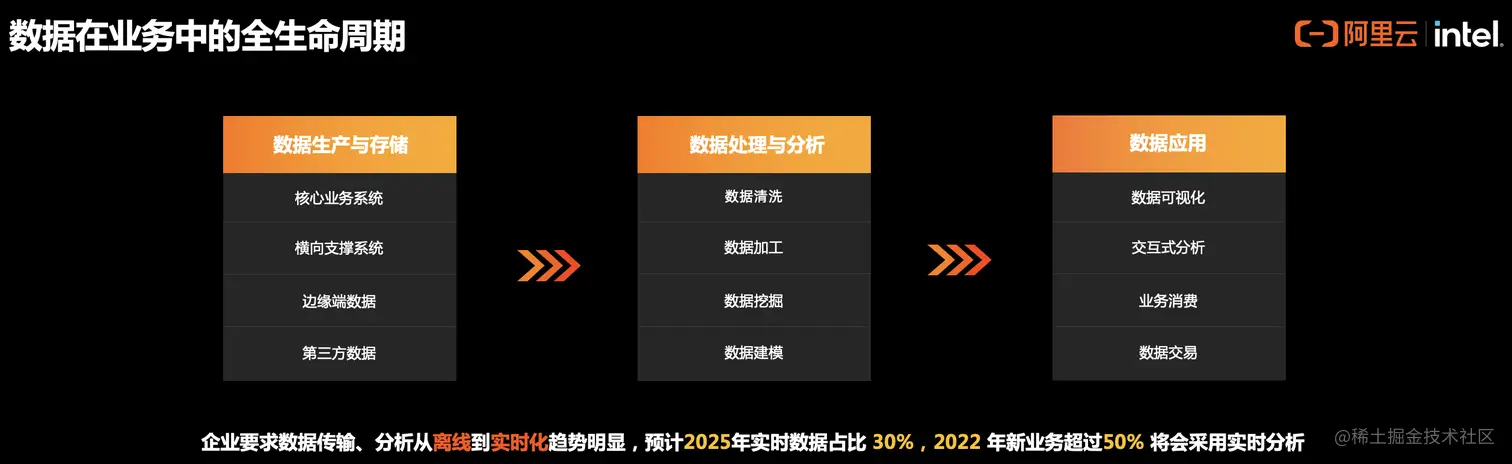 回看一个企业内部整个数据生产的生命周期,包含的数据生产与存储,数据的处理和分析以及数据应用,但实际上很少有一个平台把这三个方面全部打通做成统一支撑的平台。大部分企业随着各个业务的发展会产生根据业务特点定义的数据存储生产系统,企业的数仓分析也大部分是独立建设的,在这个过程中如何实现数据系统之间的打通和价值挖掘,就变成比较困难的问题。所以在各个报告里面我们看到在2022年新业务使用实时数据的占比会达到50%以上。