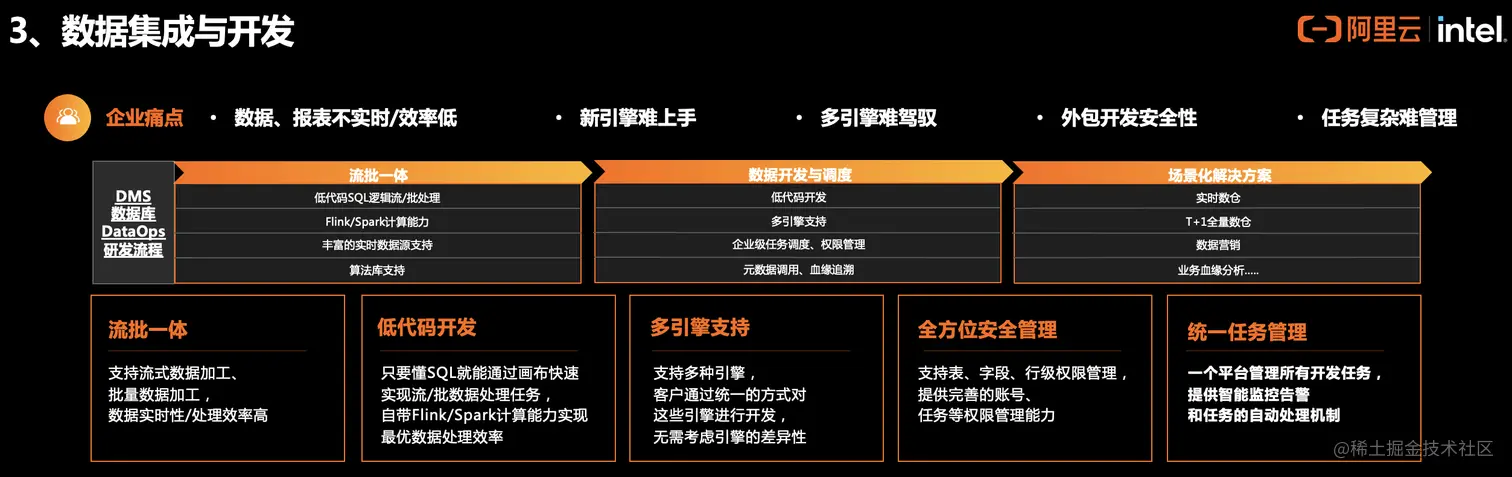DMS包含了几个重要的核心技术特性,主要包括数据资产与安全,数据库DevOps能力以及数据集成与开发。