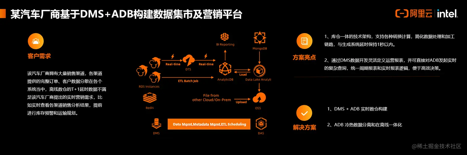 下面介绍两个实践,第一个案例:某汽车厂商使用DMS+ADB的解决方案来构建数据集市和营销平台。