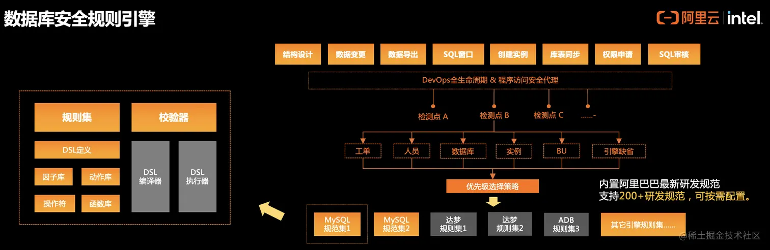 安全规则引擎本质是把企业的结构设计、数据变更、数据导出等等操作和操作的具体对象,比如对应的数据库类型(每种数据库类型可能都有不一样的最佳实践),以及对应的工单人员等等串起来,形成操作人、操作动作、操作对象相关的权限映射。阿里内部沉淀了超过两百多的研发规范模板可以默认使用,也可以由企业内部根据需求来定义自己的DSL,能够很方便的去定义安全规则能力。