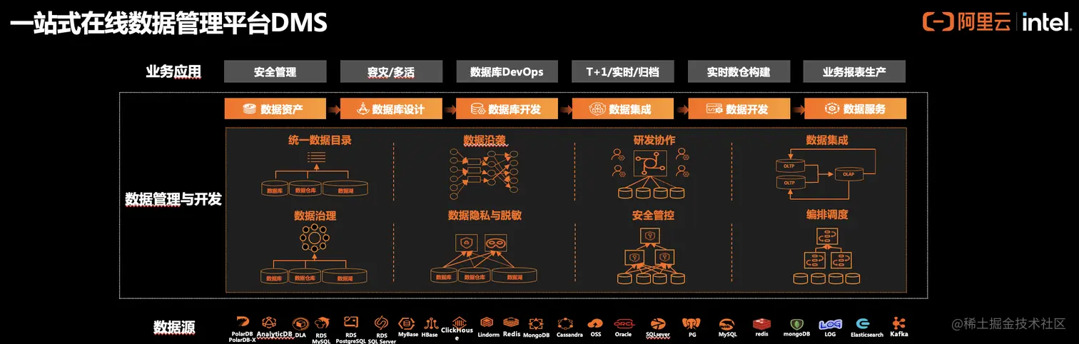 DMS统一管理企业的数据资产,包括数据库的开发和设计、数据集成与加工、数据开发、数据分析、数据应用,整个过程全面打通。从架构图看到,底层对接各种异构的数据源,在中间沉淀了类似数据血缘,数据治理,数据编排,和任务调度,这些都会成为我们中间很重要的数据支撑能力。上层我们会把应用的场景产品化,比如数据安全管理,容灾/多活能力,数据归档、实时数仓构建等等一些能力产品化,这样就可以让更多的企业低门槛去使用数据解决方案。