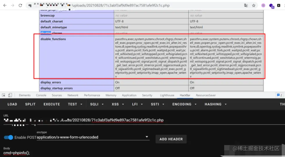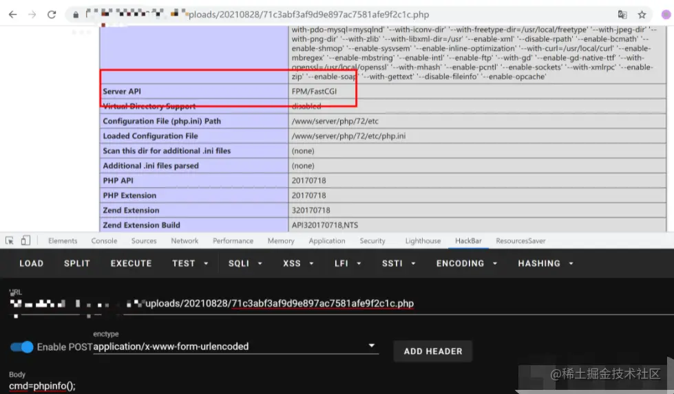 看一下phpinfo,发现存在fpm/fastcgi,可以借助这个点绕过disable_function,达到命令执行的目的,再看一下disable_functions里禁用的函数方法,扫了一眼我常用的都在里面了,就不细看了,想办法绕过就完事了