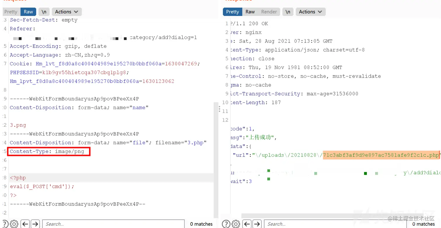 尝试上传一句话,直接以php结尾,上传失败,常规绕过手段,修改content-type为image/png,成功上传