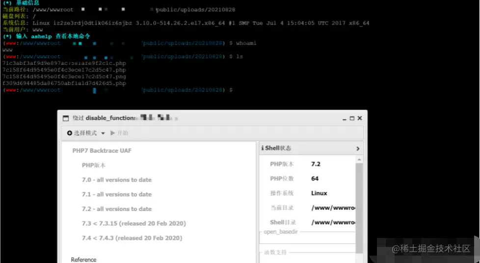 想起了之前比赛用过的利用UAF脚本来绕过disable_funtion,可以从Github上对应的地址下载脚本进行手动上传,也可以用蚁剑里的插件直接绕过,这次选择了Backtrace UAF,该漏洞利用在debug_backtrace()函数中使用了两年的一个 bug。我们可以诱使它返回对已被破坏的变量的引用,从而导致释放后使用漏洞