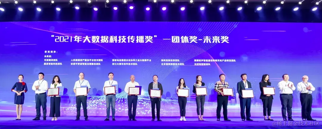 ▲ 左起第三位:百度集团副总裁吴甜 代表百度翻译团队 领受2021年大数据科技传播奖未来奖